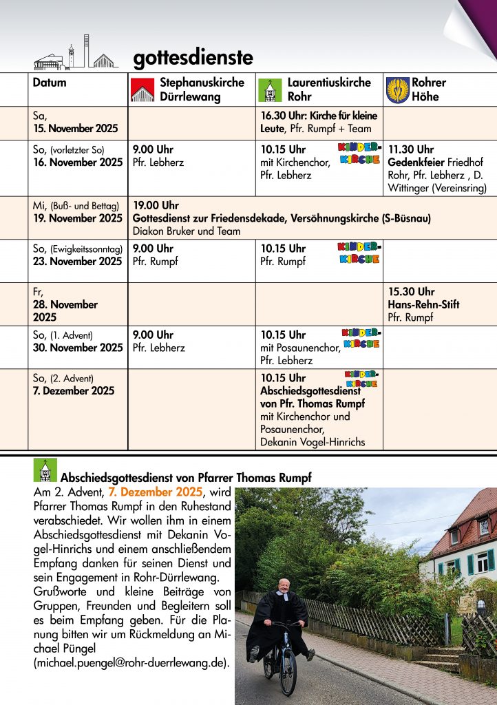 Seit dem 30. Juni 2024 wurde auch in unserer Gemeinde Rohr-Dürrlewang die Zahl der Gottesdienste reduziert. Der Kirchengemeinderat hat diesen Beschluss sorgfältig bedacht.