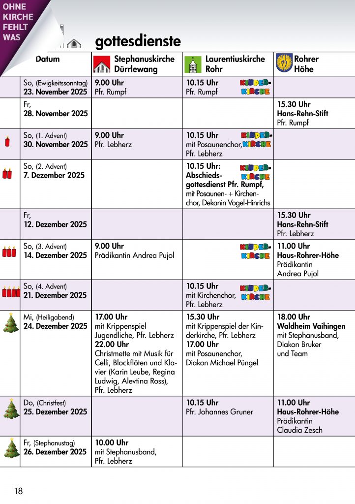 feiern wir im Stadtbezirk gemeinsam einen Distriktgottesdienst. Ort und Zeit werden jährlich neu festgelegt. In Rohr-Dürrlewang wird kein