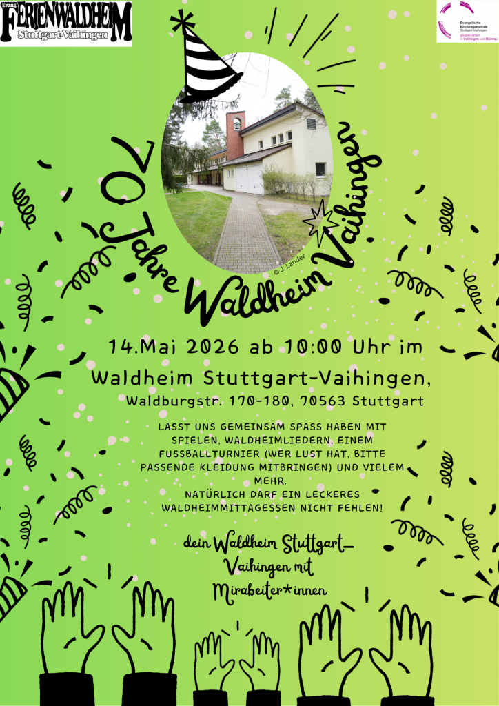 Wir laden herzlich zu einem Festgottesdienst am 14. Mai 2026 um 10.00 Uhr ins Waldheim Vaihingen ein. Mit diesem Gottesdienst wollen wir den Tag starten und gemeinsam mit leckerem Essen und einem bunten Programm feiern. Neben Spiel, Spaß und leckerem Waldheimessen dürfen natürlich die Waldheim-Hits, wie es zu einer Party gehört, nicht fehlen.